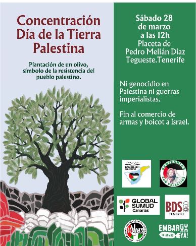 Mañana sábado día 28 de marzo de 2026 a las 12:00 horas en la Placeta Pedro Melián Díaz de Tegueste (Tenerife) hay convocada una Concentración por el Día de la Tierra Palestina. Les enviamos la convocatoria para todas aquellas personas que quieran acudir.